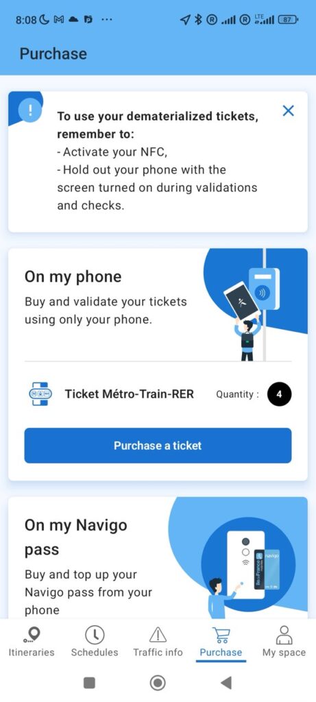 続いて「IDF Mobilites」(もしくは「Bonjour RATP」)を開き、右下の「Purchase」をタップ。