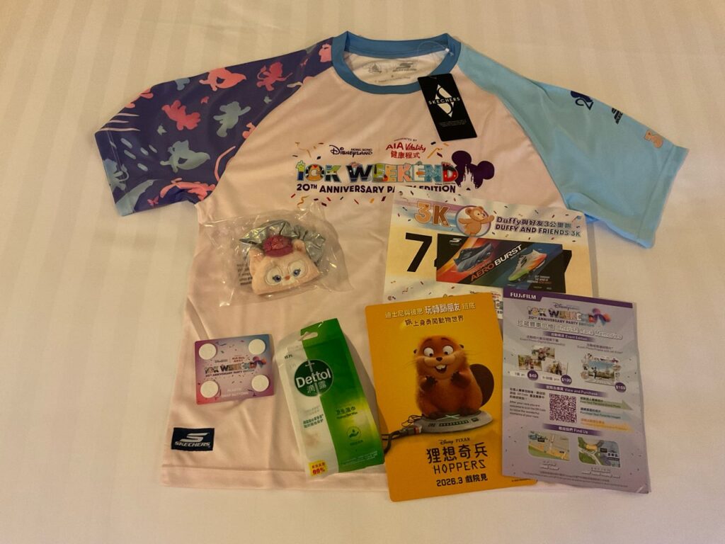 受け取ったもの。マラソンの特典としてオリジナルTシャツに20周年記念のミニイヤーハットなどが配られました