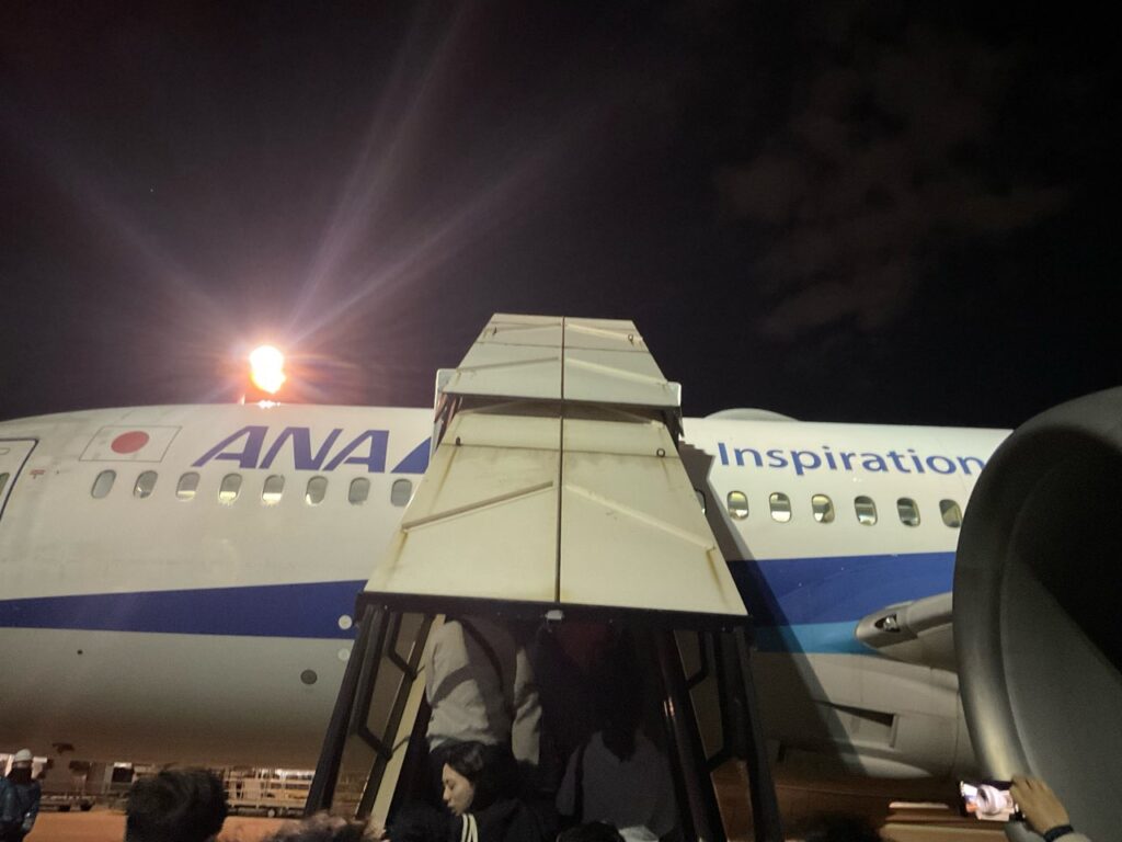 バスで移動し、再びタラップで別の飛行機へ。