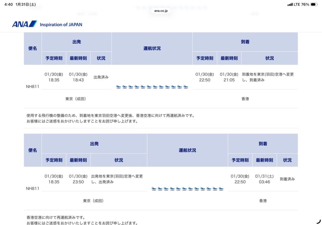(ただこの案内によると、羽田22:45発予定だったらしい…ずいぶん延びたな)