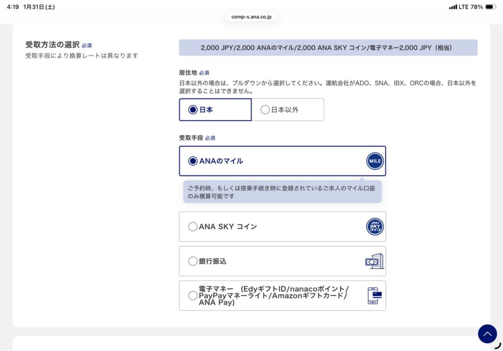 銀行振込や電子マネーなど様々な受取方法がありましたが、私はANAのマイルを選択。
